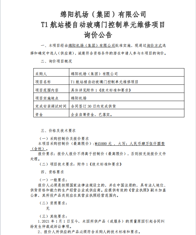 綿陽機(jī)場(集團(tuán))有限公司 T1航站樓自動玻璃門控制單元維修項(xiàng)目詢價(jià)公告